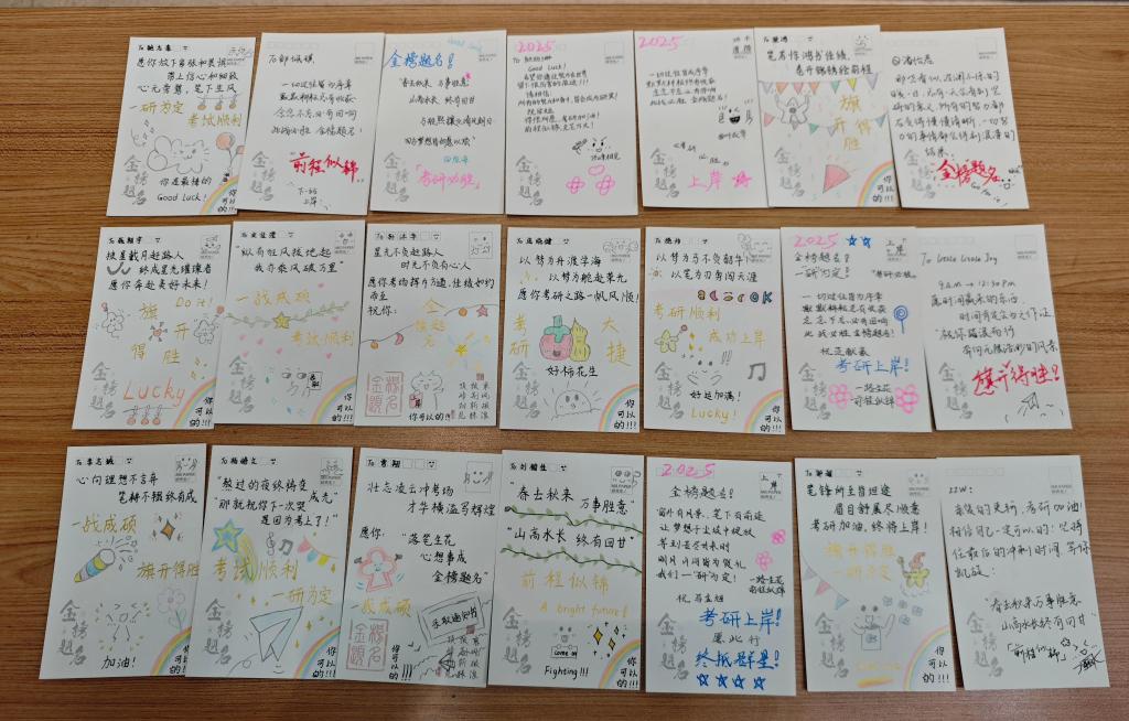 温情传递环节暖意融融。陪伴学子成长的副班主任及2021级成功上岸的高分学长学姐,通过精心录制的视频分享了宝贵的备考经验与真挚鼓励;系主任、专业教师与班主任代表也来到现场,与同学们亲切交流,送上“一战成硕”的真挚期许;班级同学精心准备了手写祝福贺卡,字里行间满含并肩同行的情谊与对未来的美好祝愿,让备考之路不孤单。