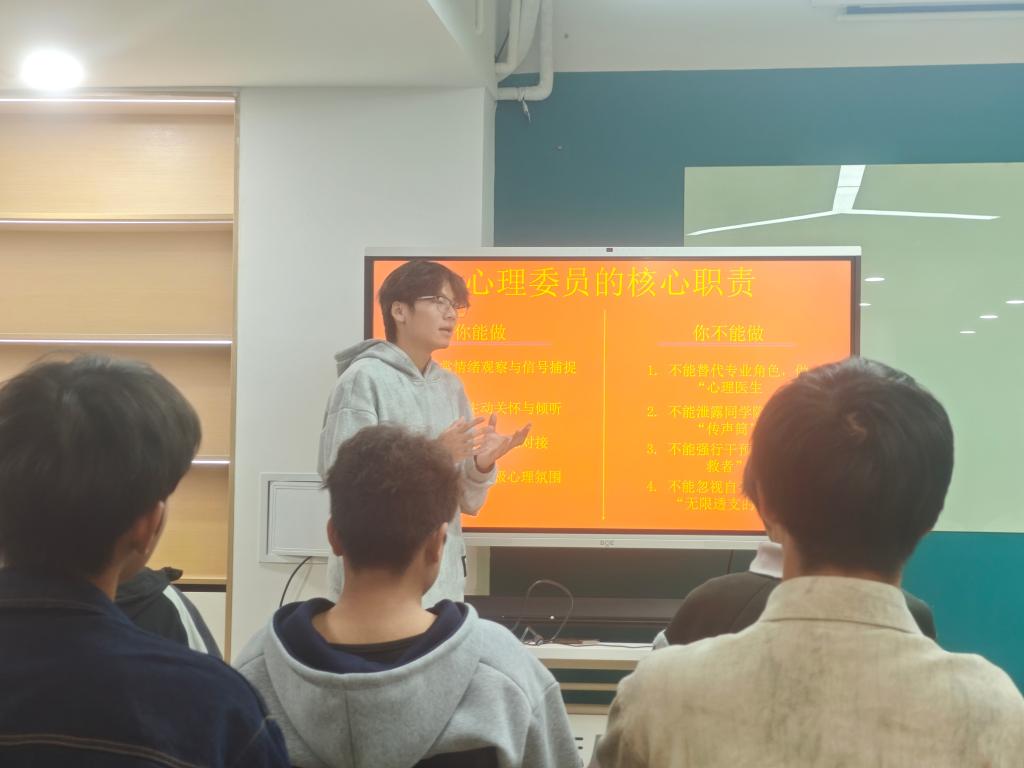 赋能宿舍“前哨”,筑牢心理安全第一线。宿舍是开展大学生心理健康教育的重要场所。学院面向2025级全体宿舍长开展心理健康专题培训,明确宿舍长作为“小家长”“知心人”与“安全员”的角色定位。培训内容涵盖常见心理风险信号的识别、“倾听—共情—引导”沟通技巧以及朋辈支持策略,切实提升宿舍长在早期发现与初步干预中的能力。