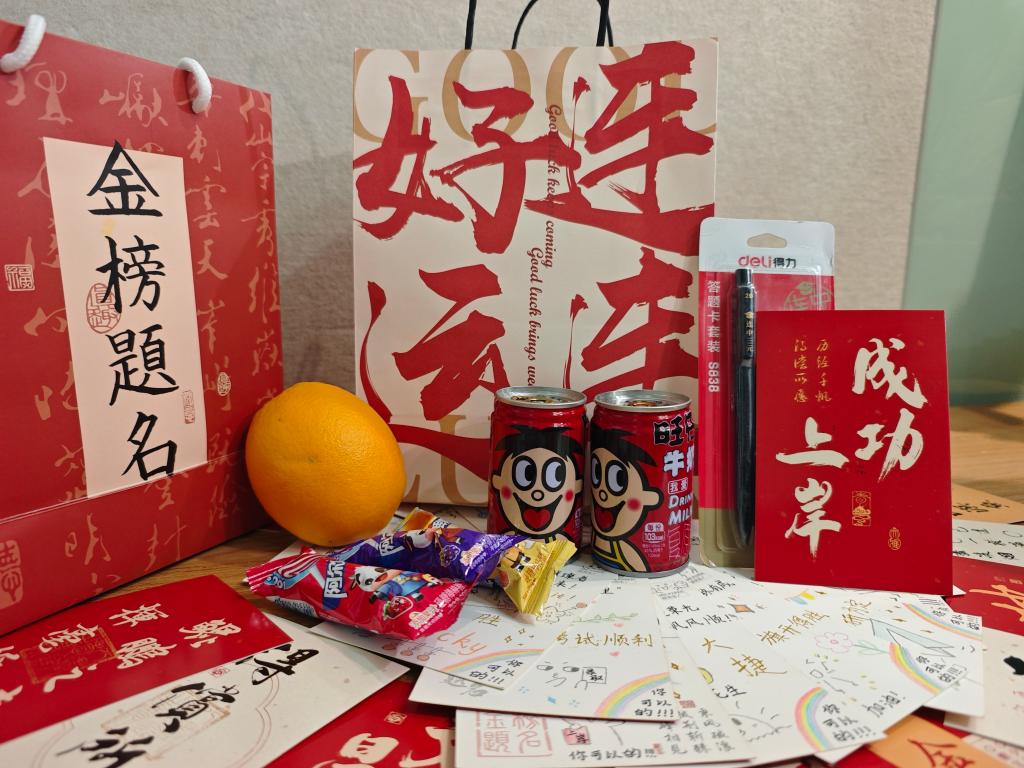学院为每位考研学子精心筹备“考研加油包”,其中有寓意 “心想事成” 的橙子、“运气旺旺” 的旺仔牛奶、“巧克难题” 的巧克力、“榜上有名”的棒棒糖,为学子们补充能量,另有驱散寒意的暖宝宝与助力书写的“一举夺魁”祈福文具,为冲刺备考保驾护航。每一份礼物都饱含学院的深情厚谊,承载着对学子们金榜题名的美好祝愿与殷切期盼。
